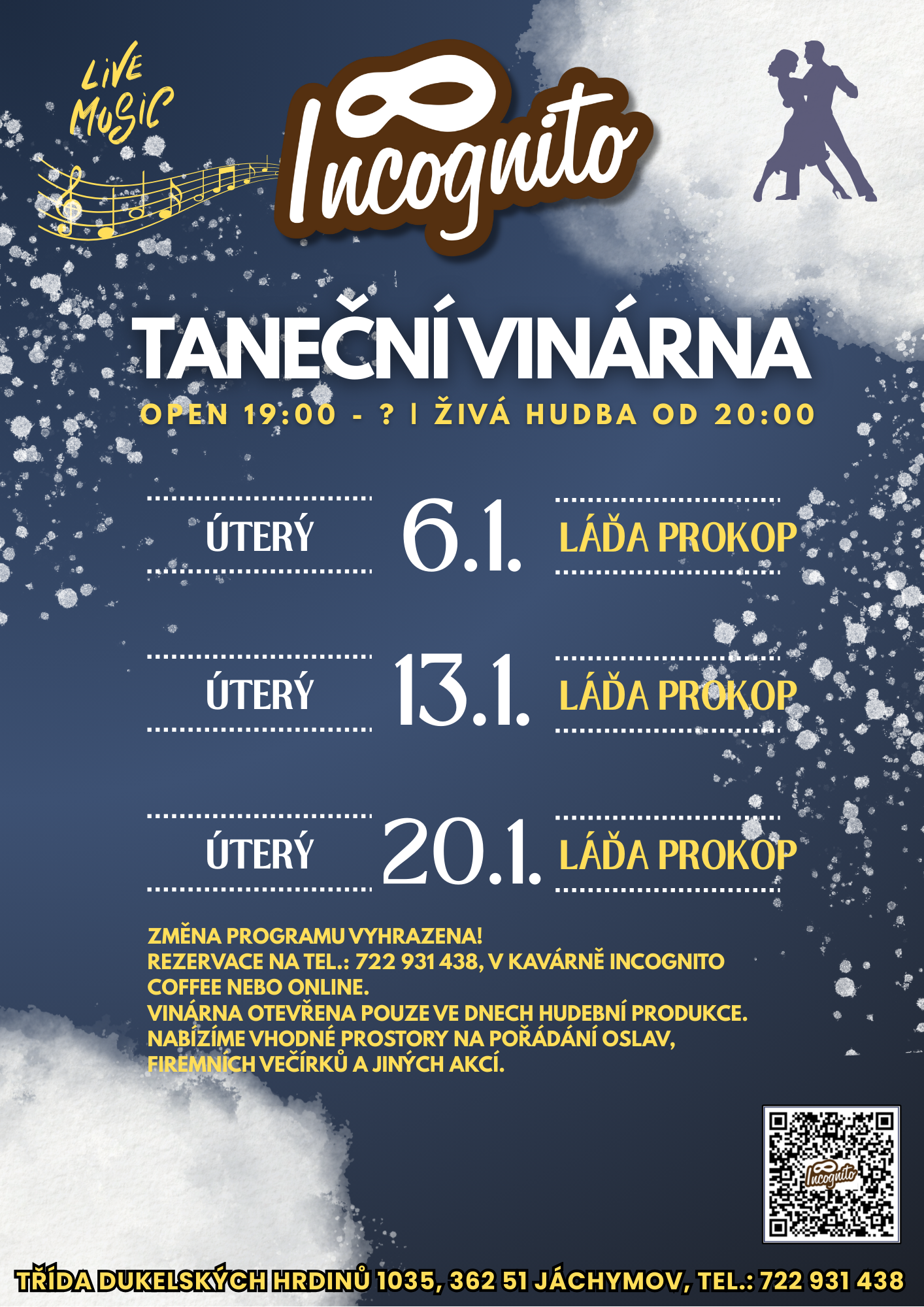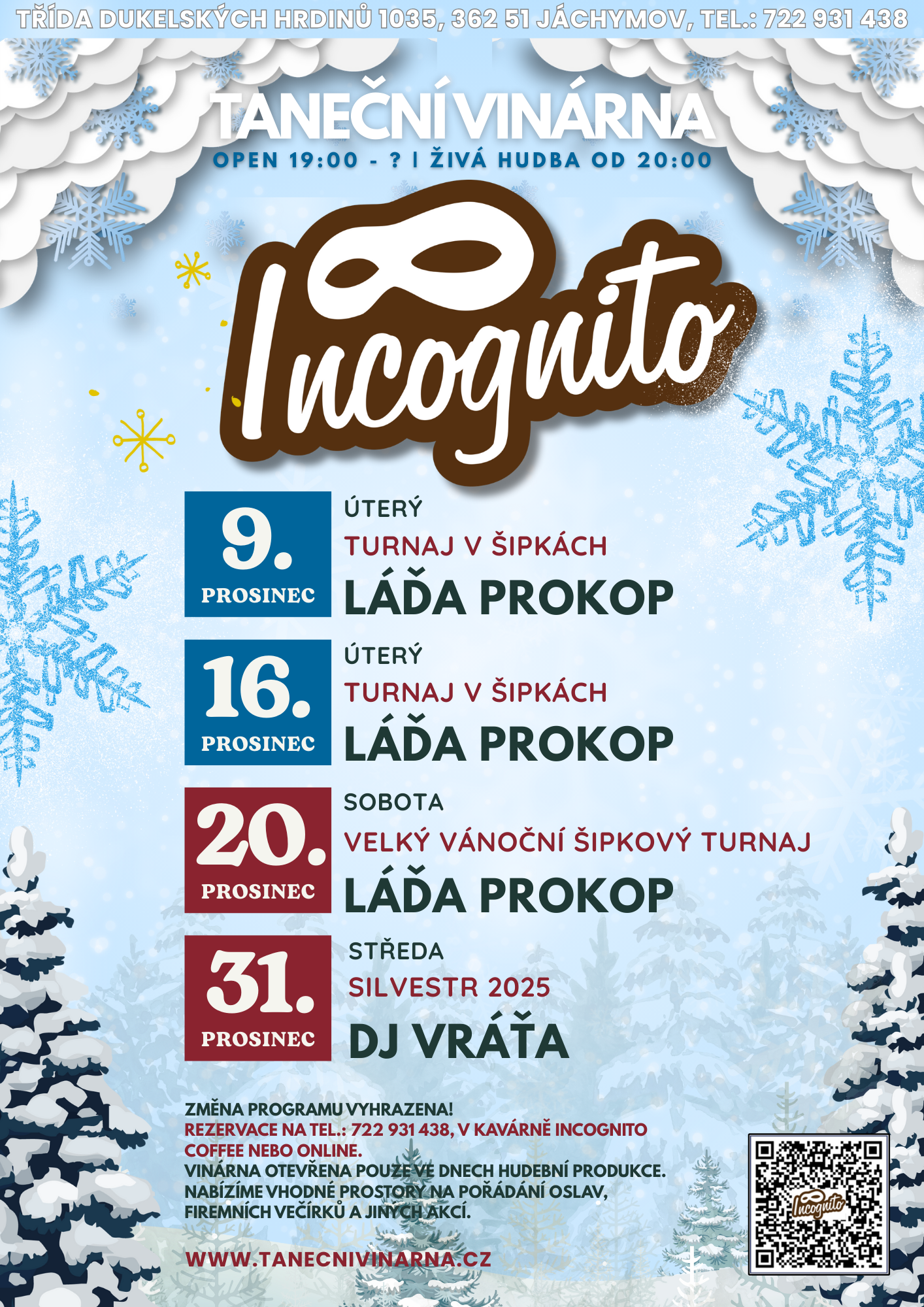 Pro všechny milovníky tance a dobrého vína jsme připravili novou Taneční vinárnu Incognito s živou hudbou. Naše prostory jsou vhodné také pro pořádání různých oslav narozenin, svátků, svateb, firemních večírků apod..